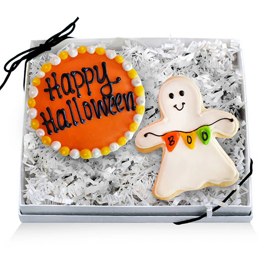 The Halloween Favor Gift Box designs for thrice the fun! Each Halloween Gift Box has 2 freshly baked and expertly hand decorated Halloween Cookie Favor design featuring The Witch Is In, Happy Halloween, Boo Ghost, Hocus Pocus or Bubbling Cauldron ready to deliver Halloween fun to their doorstep.Â